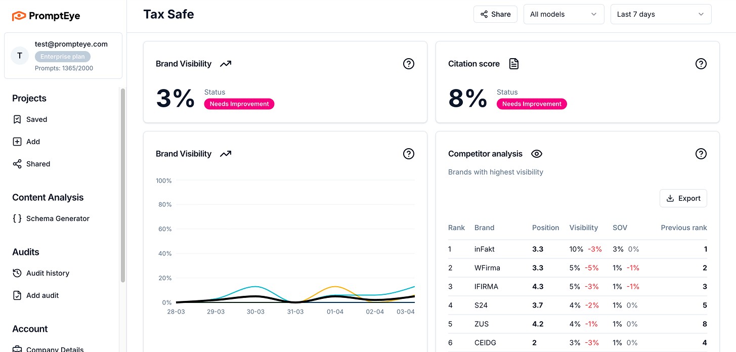 PromptEye is a visibility analytics tool that tracks how your brand, products and competitors are represented in content generated by AI models.